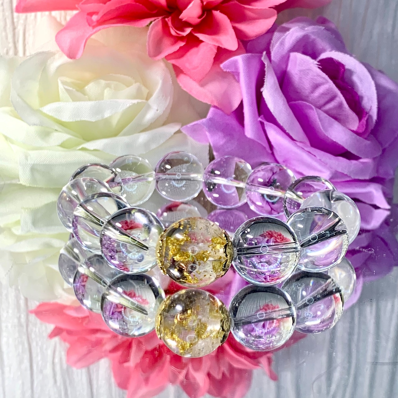 水晶に隕石入りオルゴナイト球を1粒付けたブレスレットが入荷いたしました!