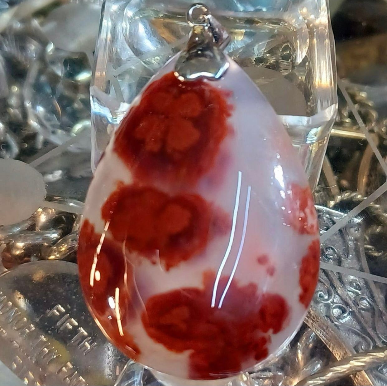 シナバーインカルセドニーは、石英結晶の透明さや輝きと、シナバーの鮮やかな赤色とのコントラストが美しいとされています。